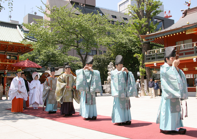 神田明神は社伝によると、奈良時代、天平2(730)年創建とあり、1270年以上の歴史を経た都内で最も歴史ある神社のひとつとして知られています。江戸時代より明神様と呼ばれ、『縁結びの神様』として親しまれてきた江戸の総鎮守、神田明神。現在でも、神田・日本橋・秋葉原・大手町・丸の内など、108ヶ町の総氏神様として江戸の素晴らしい伝統文化を保ち、守り続けています。 社殿に向かって一筋にのびる赤い絨毯の上を、和装を身に纏い、雅楽の音色に包まれながら、お二人と親族の皆様が一歩一歩社殿へと歩を進めます。緑に包まれた艶やかな朱塗りの社殿で、糸が張ったような静寂のなか、和の心溢れる美しい挙式を挙げることができます。